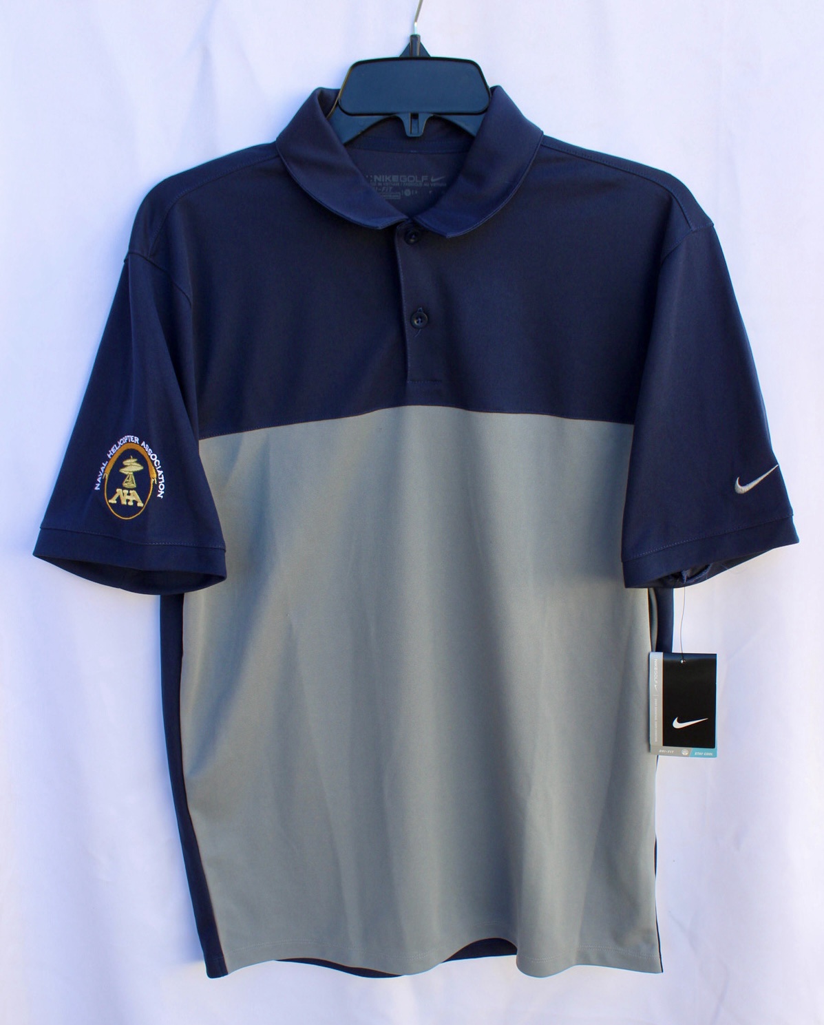 Look sharp on and off the course with the official NHA Nike Golf Polo. Designed for comfort and performance, this two-tone navy and gray polo delivers a polished look with premium moisture-wicking fabric to keep you cool and dry all day long.